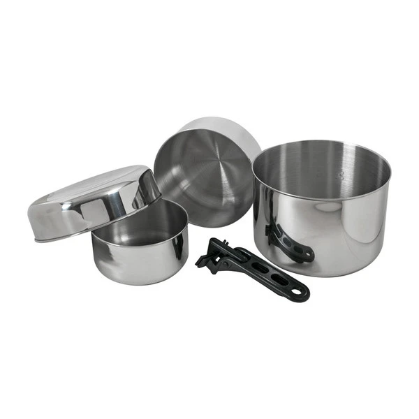 Ein Topfset passend für 3-4 Personen. Das Biwak-Set ist mit seinen 3 Töpfen und der Pfannen-Deckel-Kombination dafür ausreichend dimensioniert.