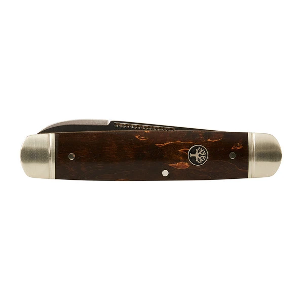 Das Cattle Knife ist die Ur-Form des Taschenmessers und hier in Bilderbuch-Qualität umgesetzt. Es besitzt eine universelle Klingenlänge von 8,2 cm und einen geriffelten Nagelhau, an dem sich geeignete Streichhölzer entzünden lassen. Der Griff aus braun stabilisiertem Maserbirkenholz liegt angenehm in der Hand und wird durch Backen aus Neusilber (Kuper-Nickel-Zink-Legierung) in Szene gesetzt. Das historische Baumzeichen-Emblem von Böker ist farblich und optisch passend im Griff eingesetzt.