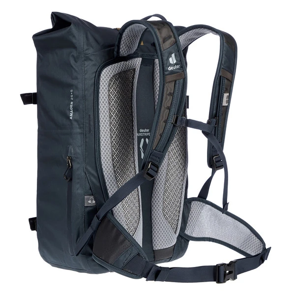 Für einen bequemen und sicheren Sitz sorgen die Bikesport-erprobten Komponenten wie die ergonomisch geformten Schultergurte und der verstellbare Brustgurt. Hinzu kommen die anschmiegsamen Hüftflossen, die den guten Halt beim Radfahren optimieren. Das durchdachte Airstripe Tragesystem sorgt dafür, dass dein Rücken angenehm trocken bleibt. Es verfügt über eine geringe Rückenauflage sowie ein luftdurchlässiges Abstandsgewirke (Air Space Mesh) für hohe Atmungsaktivität und maximale Luftzirkulation. Apropos trocken: Dank des wasserdichten Materials werden Laptop, Unterlagen und andere Gegenstände im Rucksack bei Regen geschützt. Um dies zu gewähren musst du den Rollverschluss 3x rollen.