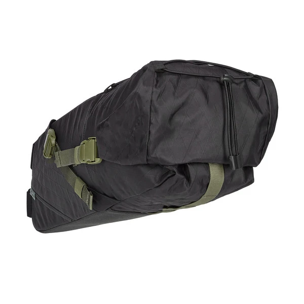 Satteltasche fürs Bikepacking; die eigenstabile Tasche mit Rollverschluss befestigst du an Sattel und Sattelstütze. Das schafft Stauraum für deine Gravel-Touren mit wenig Gepäck.