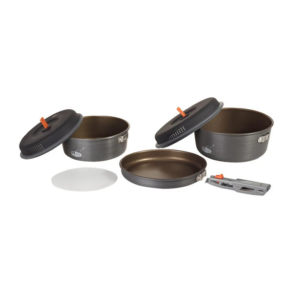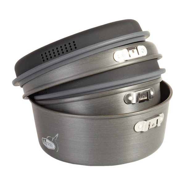 Die beiden Töpfe mit 2 Liter und 1,5 Liter Volumen, sowie die Pfanne mit 20,3 cm Durchmesser, haben eine original Teflon Antihaftbeschichtung. Die passenden heat nFORM (hitzeresistenter Kunststoff)-Deckel sind nicht nur schön leicht, sondern auch mit Ausgussmöglichkeiten versehen. So bleiben deine mühsam geschleppten Nudeln im Topf und müssen nicht von der Wiese gesammelt werden. Und dass die Transport-Verpackung eine wasserdichte (Abwasch)Schüssel ist, rundet den perfekten Eindruck ab. Kleiner Topf und Pfanne teilen sich den clever faltbaren und stabilen Griff und ein Schneidebrett versteckt sich auch noch zwischen den Töpfen. Wenn da das Essen nicht schmeckt, lag es nicht am Kochset!