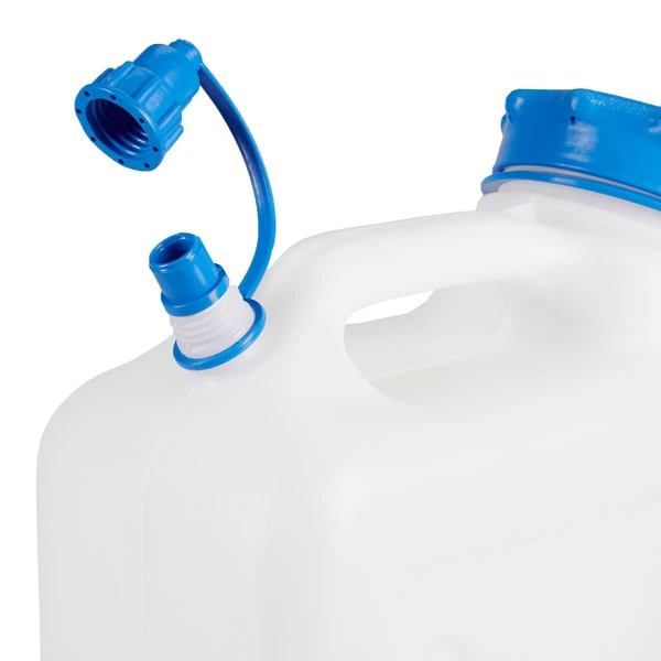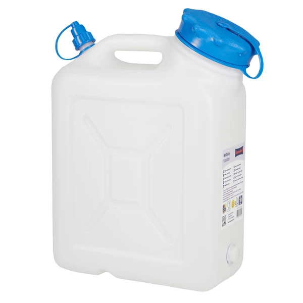 Das Polyethylen-Material ist sehr robust und UV-beständig. Diese Variante besitzt einen zweiten, kleinen Ausguss, um auch Trinkflaschen sicher zu befüllen. Der Verschlussstopfen am Boden kann entfernt werden, um ihn gegen einen optional erhältlichen Wasserhahn auszutauschen. So ist es möglich das Wasser fein dosiert dem Kanister zu entnehmen.