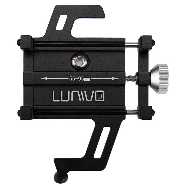 Wertiger Handyhalter aus Aluminium, gemacht für Smartphones bis zu 6,5 Zoll. Die Breite des Halters ist mit einer komfortablen Rändelschraube von 55 bis 95 mm einstellbar.
