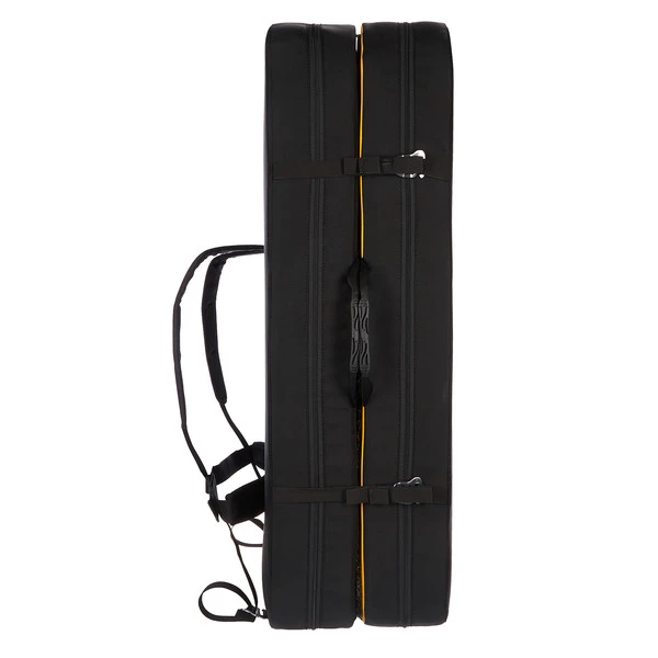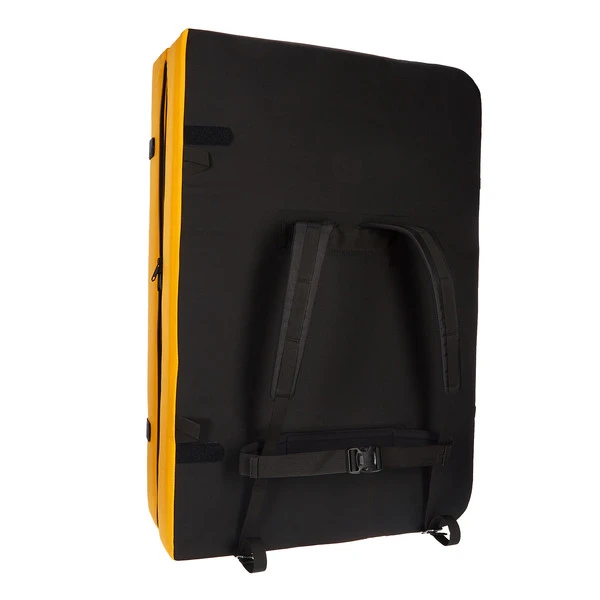 Zum Transport wird die große Bouldermatte einmal in der Mitte zusammengeklappt und mit Hakenschnallen aus Aluminium fixiert. Zwei Klettriemen verhindern ein ungewolltes Aufklappen. Gepolsterte Schulter- und Hüftgurte machen den Weg zum nächsten Boulder bequemer.