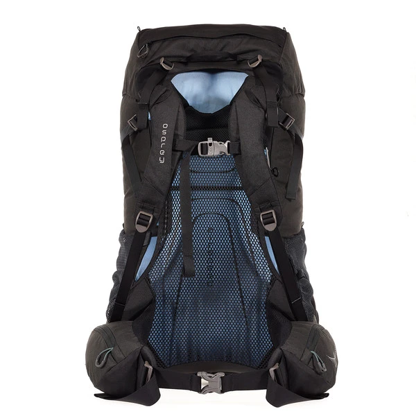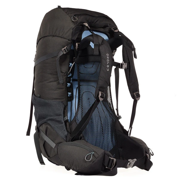 Die Rückenplatte des Rook 65 lässt sich in der Höhe verstellen. Dies funktioniert über ein unkompliziertes Knebel-System. Auch die Schultergurte sind anpassbar. Trotz der Höhenverstellbarkeit ist es Osprey gelungen, den gespannten AirSpeed-Netzrücken einzusetzen. Dieser sorgt dafür, dass die Luft zwischen deinem Rücken und dem Rucksack zirkulieren kann. Das dünne, aber äußerst robuste Mesh liegt komfortabel an und sorgt für ein trockenes Tragegefühl.