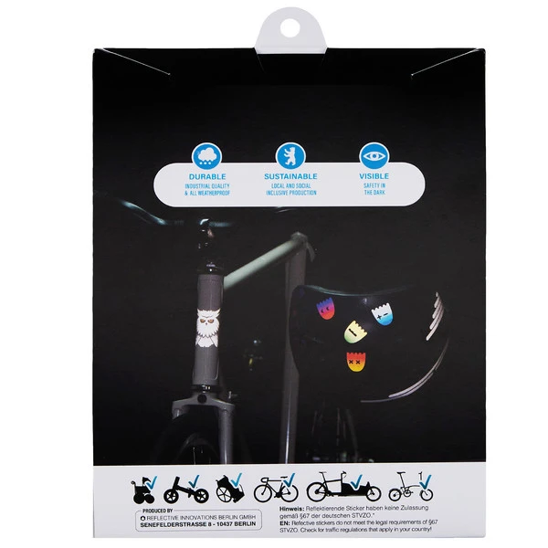 Mit leuchtendem Beispiel vorangehen – und zwar nach draußen! Mit diesen vier Stickern kein Problem, denn sie strahlen dank Reflective Berlin schön hell zurück, wenn sie angeleuchtet werden.
