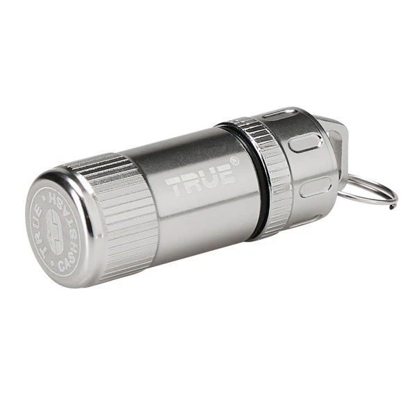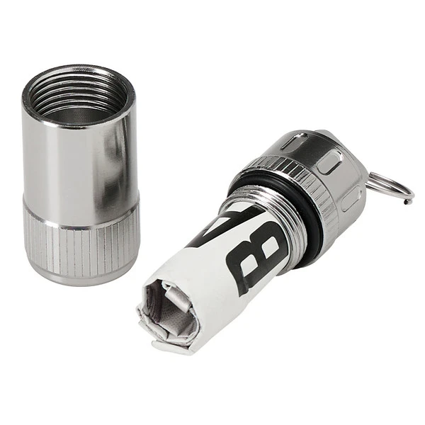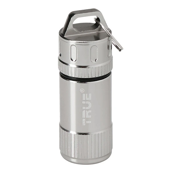 Das Etui besteht aus Edelstahl und kann dank Gummidichtung wasserfest verschlossen werden. Am Schraubdeckel ist eine Öse befestigt, die dir das Anbringen an einem Schlüsselbund ermöglicht. Im Innern findest du eine Edelstahlklammer, mit der du deinen Geldschein auf die optimale Größe einrollen kannst, damit er im Behälter verstaut werden kann.