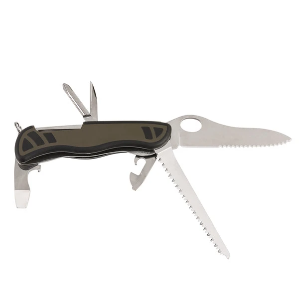 Holzsäge, Dosenöffner mit Schraubendreher, 3 mm Kapselheber mit Schraubendreher 7 mm und Drahtabisolierer, Kreuzschlitzschraubendreher, Bohr-/Stechahle, Federstahlring.