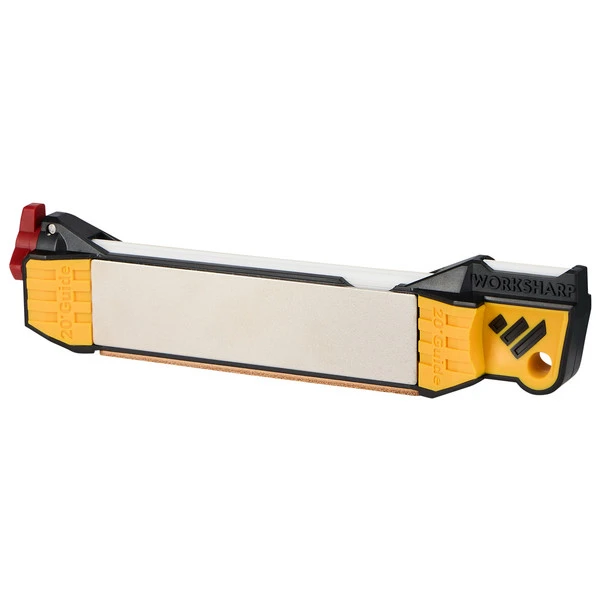 Das manuelle Schärfen erfordert etwas Übung. Damit du von Anfang an optimale Ergebnisse erzielst und den richtigen Winkel findest, stehen seitliche Winkelführungen mit einer Neigung von 20 Grad zur Verfügung. Dies erleichtert die Klingenführung unterwegs, selbst wenn du keine optimale Unterlage zum Schärfen hast. Wenn du hingegen zu Hause am Tisch sitzt, verhindern gummierte Winkelführungen, dass der Messerschärfer beim Einsatz als Bankstein verrutscht.